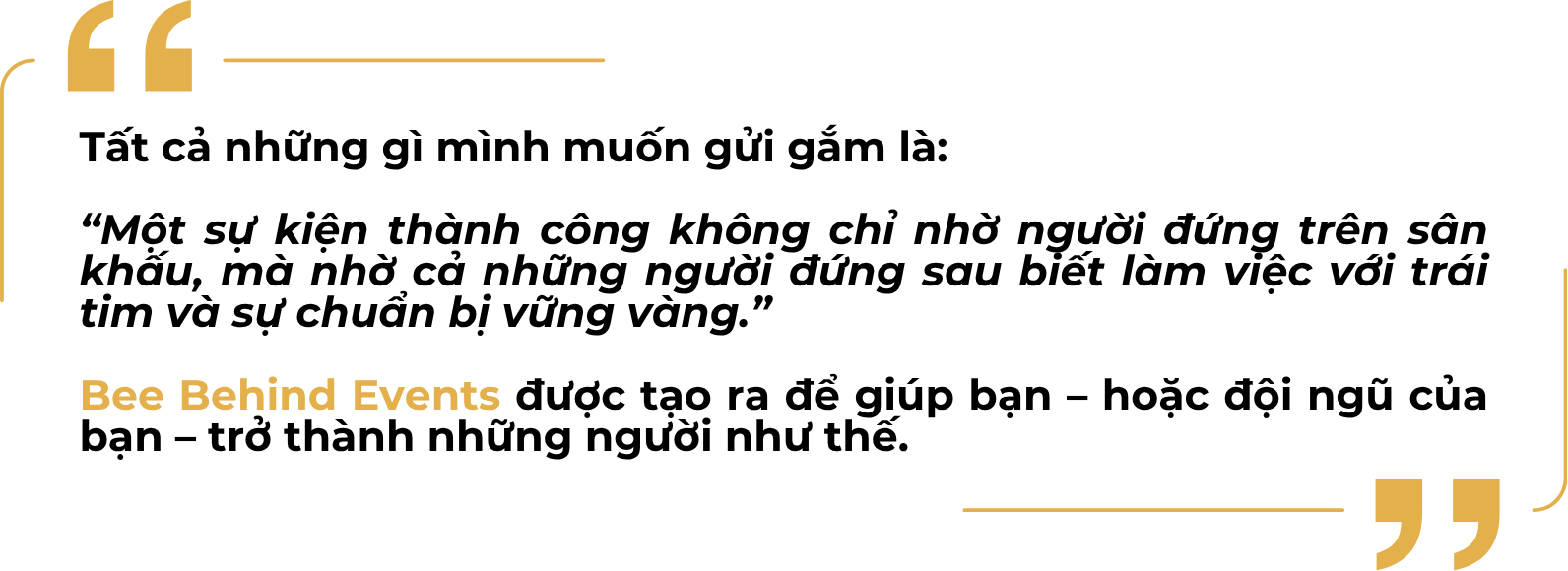 Mình tin rằng, đằng sau mỗi sự kiện trọn vẹn đều có những “bạn ong thầm lặng” – người đứng sau hậu trường, đảm bảo cho sự trơn tru trong suốt quá trình sự kiện diễn ra. Mình gọi họ là Bee Behind – những chiến binh mang sự chuyên nghiệp thầm lặng tạo ra trải nghiệm trọn vẹn của khách hàng.